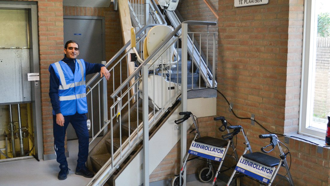 Für Bewohner mit einem Mobilitätsroller ist es natürlich nicht möglich, den Mobilitätsroller mit dem Treppenlift die Treppe hinaufzufahren. Um ihren Scooter im Erdgeschoss sicher zu lagern, vermieten wir auch temporäre Scooterlager. Der Einfachheit halber stellen wir auch Leih-Rollatoren zur Verfügung, damit die Bewohner auf ihrer Etage leichter vom Aufzug nach Hause gehen können.