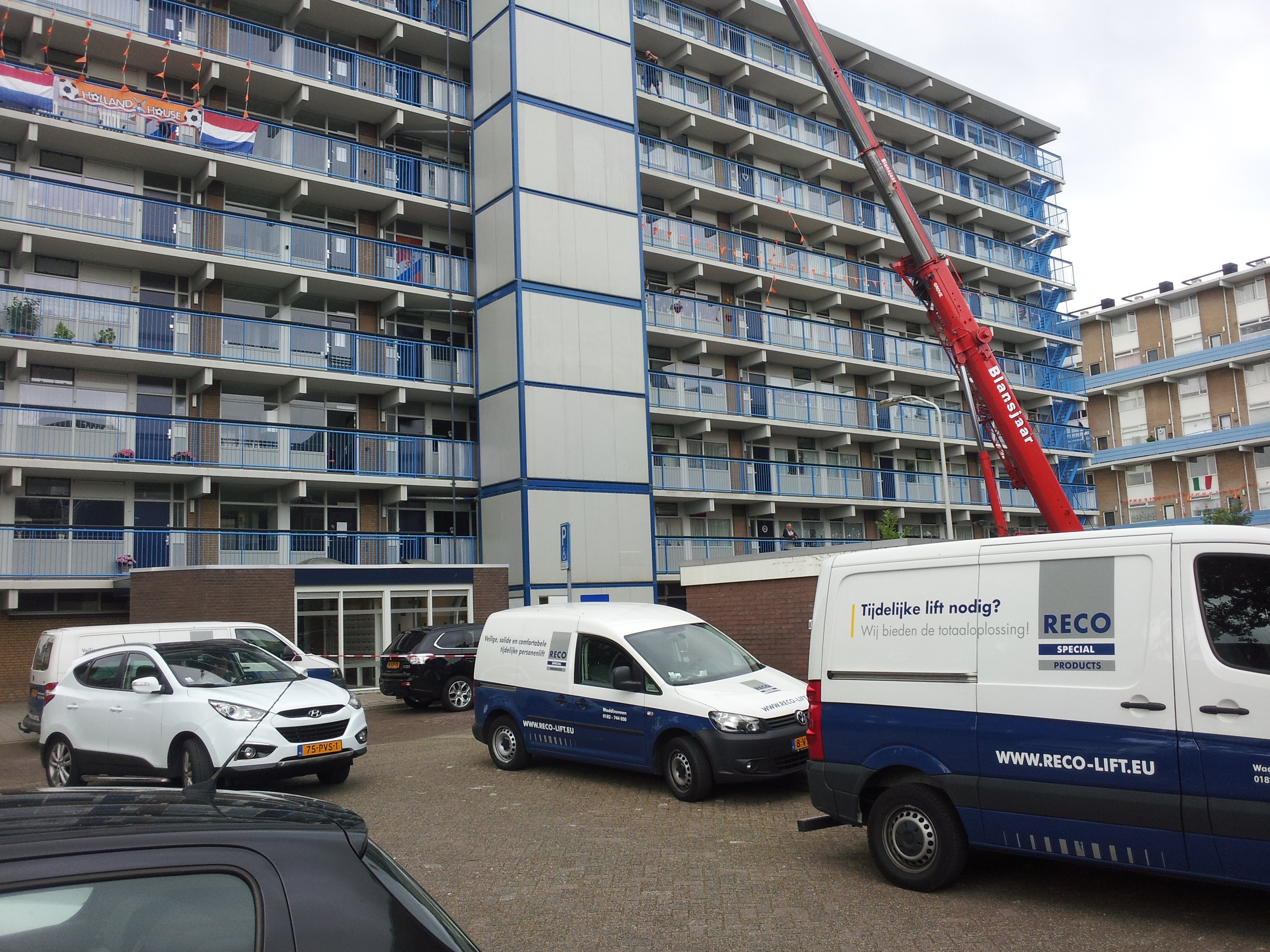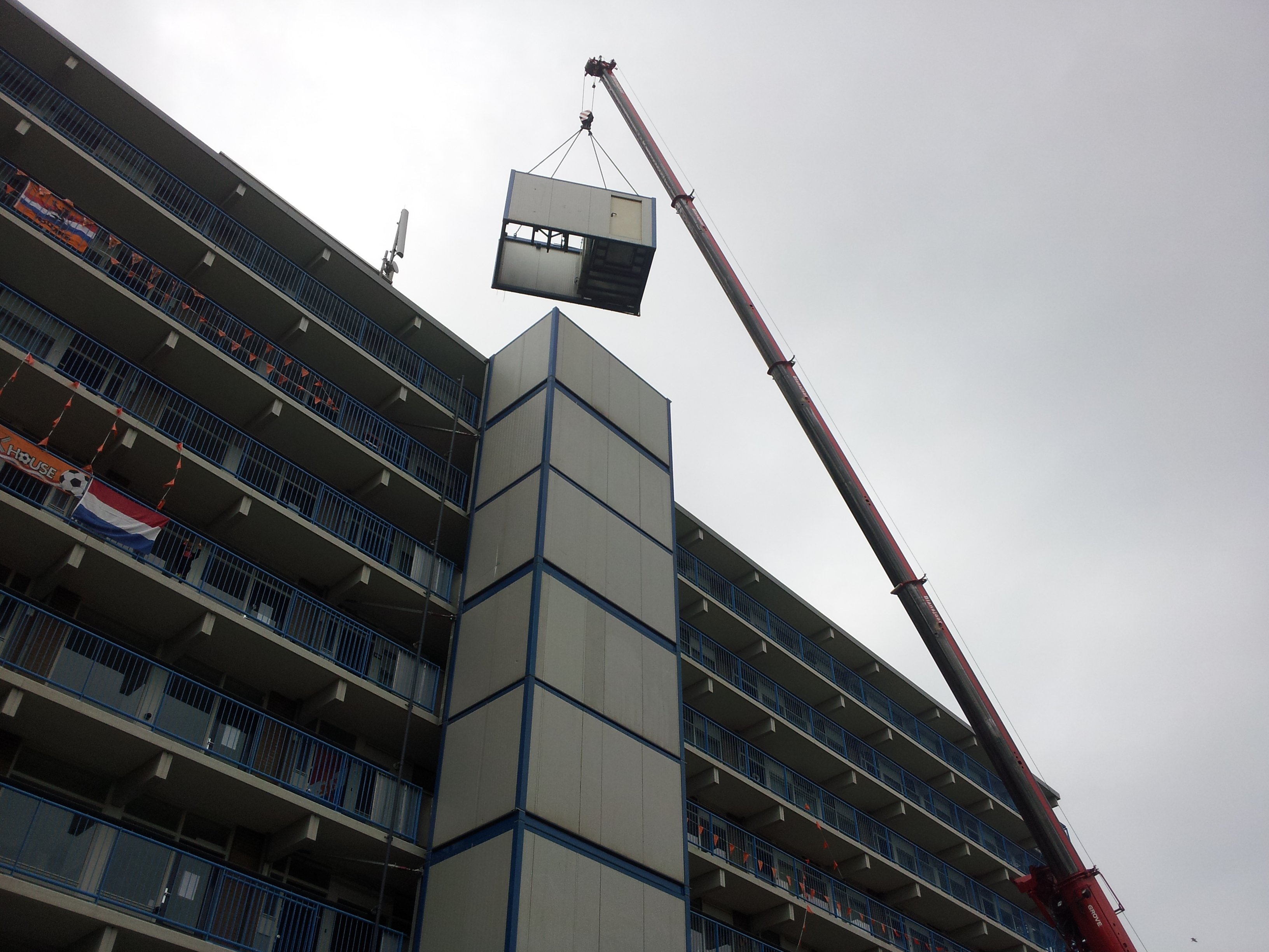 In der Sleepnetstraat in Scheveningen, wo der Aufzug seit zehn Tagen kaputt ist, wird am Samstagmorgen ein Notaufzug installiert.