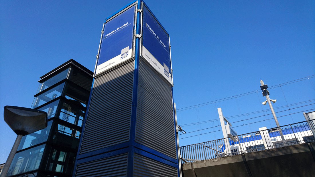 In Kürze wird mit der Reparatur des bestehenden Aufzugs begonnen. Bis diese Arbeiten abgeschlossen sind, können Reisende den provisorischen Personenaufzug RECO PP benutzen. Damit ist sichergestellt, dass sie weiterhin einen sicheren Zugang zur Station haben.