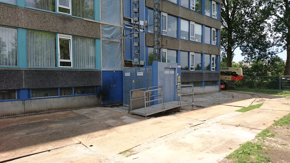 Die Wohnung auf dem Utrechter Sint Maartendreef entspricht nicht mehr den heutigen Anforderungen. Die Wohnungsbaugesellschaft Portaal hat verschiedene Beschwerden von Anwohnern erhalten und möchte diese abstellen. Darüber hinaus müssen das Wohngebäude und die Häuser ordentlich aussehen, leicht zugänglich, sicher, energieeffizient und komfortabel sein. Aus diesem Grund hat Portaal in Absprache mit der Bewohnervereinigung und einer Fokusgruppe von Bewohnern einen Renovierungsplan erstellt. Das Bauunternehmen Nijhuis Bouw führt die Arbeiten durch und hat zusammen mit Portaal RECO Aufzug Vermietung als Lieferant einer temporären Aufzugslösung ausgewählt.