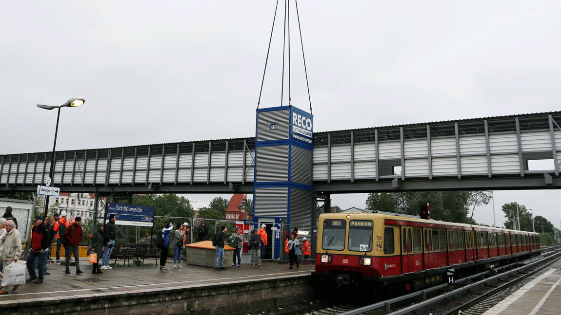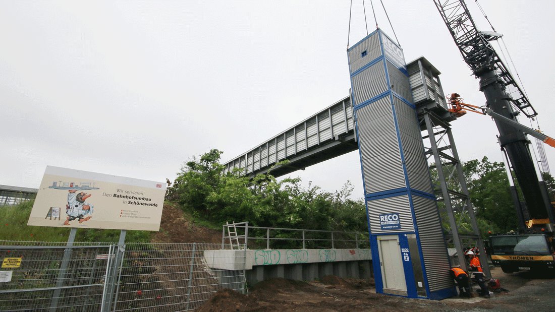 Der Bahnhof Berlin Schöneweide verfügt über einen Personentunnel, der mit Personenaufzügen ausgestattet ist. Während der Modernisierungsarbeiten können diese Aufzüge nicht mehr benutzt werden. Deshalb hat die DB beschlossen, eine provisorische Fußgängerbrücke zu platzieren. Diese Brücke wurde von Fa. Spitzke aus Großbeeren gesetzt. Um diese provisorische Fußgängerbrücke für alle Reisenden sicher und bequem zugänglich zu halten, hat Reco Lift Solutions die Brücke mit 3 temporären Reco-Personenaufzügen vom Typ PP ausgestattet.