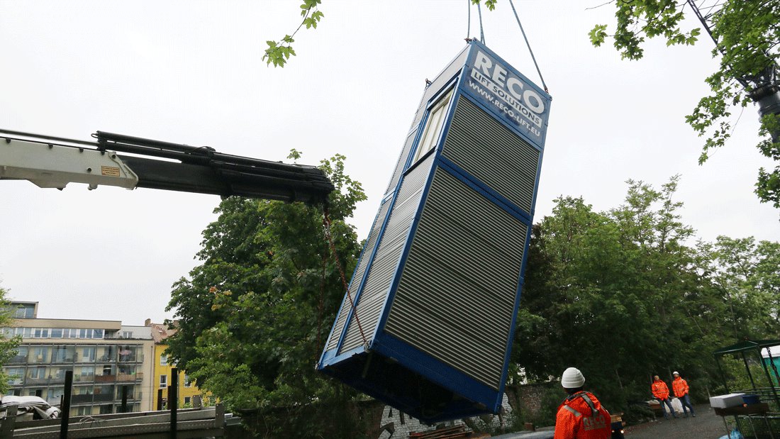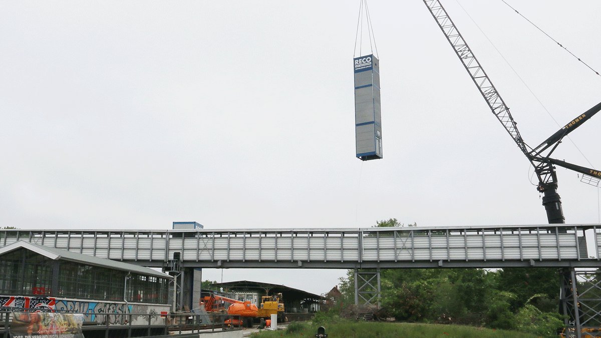 Bei diesem Projekt wurde ein Aufzug während einer Nachtschicht installiert. Die beiden anderen wurden im Laufe des Tages installiert, so dass die Installation innerhalb von 24 Stunden abgeschlossen war. Für die Montage wurde derselbe Kran (500tm-Kran von Thömen in Leipzig) verwendet, der die temporäre Fußgängerbrücke für die Firma Spitzke angehoben hat. Sowohl die Personenaufzüge von Reco als auch die Fußgängerbrücke von Spitzke sind komplett modular aufgebaut. Dies hat den Vorteil, dass beide Systeme leicht an unterschiedliche Spannweiten und Hubhöhen angepasst werden können und somit für jedes Projekt geeignet sind.