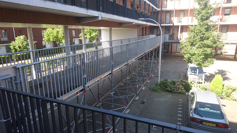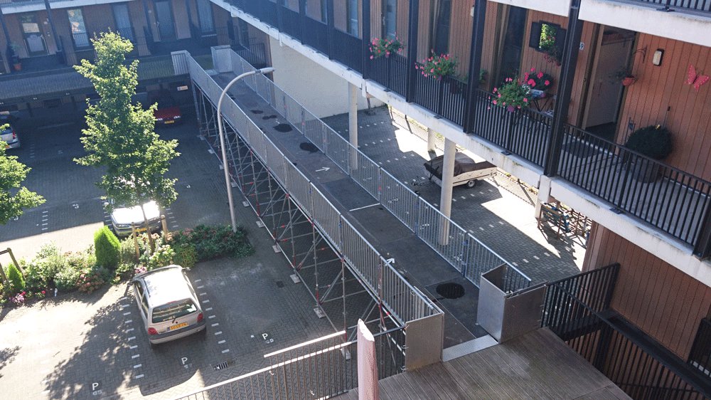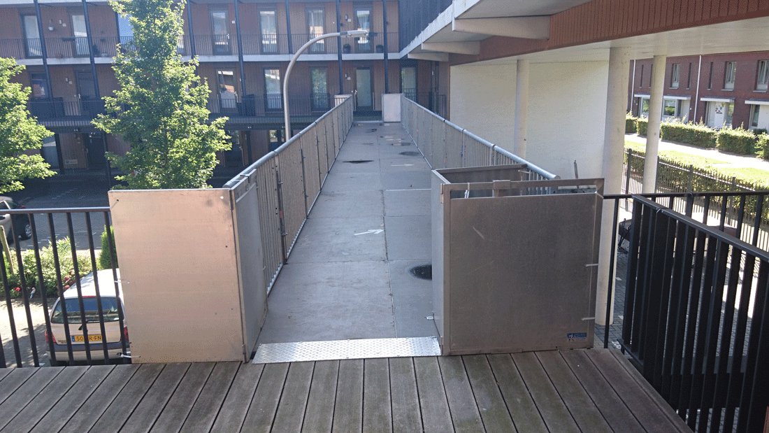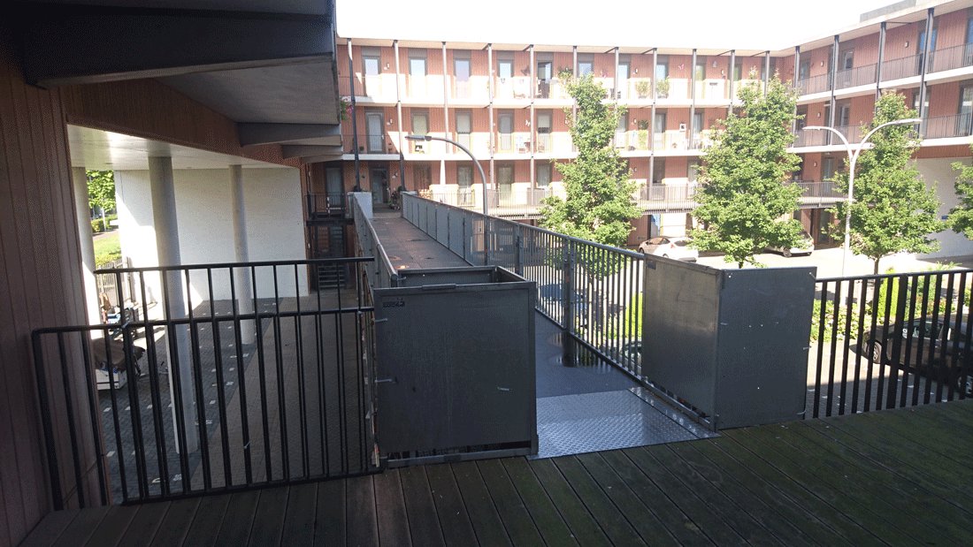 Die öffentlich zugängliche Galerie besteht aus speziellen Dielenböden und befindet sich zwischen den beiden Gebäuden. Die Bewohner können daher ihre Wohnungen über die temporäre Galerie mit dem Aufzug des anderen Gebäudes erreichen. Um behinderten Bewohnern das Hin- und Hergehen zwischen den Gebäuden zu ermöglichen, wurden speziell bearbeitete Dielenböden und publikumsfreundliche Zäune verwendet. Die temporäre Galerie wird für insgesamt 15 Wochen in Nootdorp bleiben, bis beide Aufzüge wieder in Betrieb genommen werden.