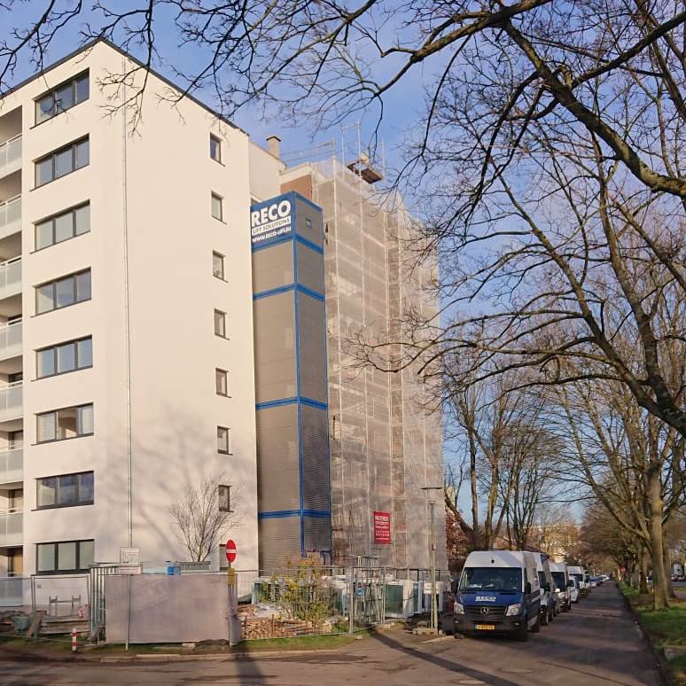 Bei der Montage wurde RECO Aufzug Vermietung von der Kranfirma Wasel aus Neuss unterstützt. Als Fundament für den Aufzugsschacht wurden Repak und Stahlstraßenplatten verwendet. Dank der Modularität eines RECO-Lifts wird die Schachthöhe an die Ausgangshöhen angepasst. Die Aufzugsfirma Schindler hat im RECO-Aufzug eine eigene Sprechverbindung installiert. Dadurch ist der Aufzug vollständig in das System von Schindler integriert. "RECO Aufzug Vermietung hat sich als flexible Organisation erwiesen, die sehr schnell einen vollwertigen Personenaufzug installieren kann. Unsere Bewohner sind sehr zufrieden und wissen unsere Bemühungen zu schätzen", sagt Peter Heine von der WSG, zuständig für Neubauten & Modernisierungen.