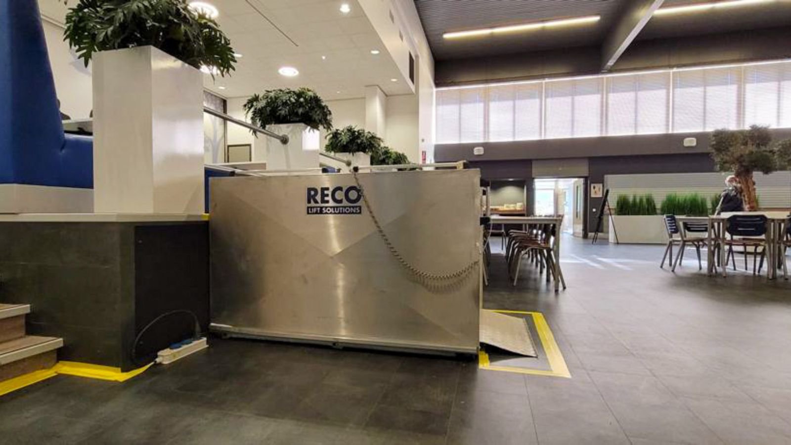 This combination of a disabled platform lift with stairs and a small viewing platform is perfect to offer a public viewpoint at a venue or exhibition. The wheelchair lift and roofed platform can also be deployed to redirect pedestrians in a shopping area or train station. Due to its small dimension and low power requirements, the entire set is quickly assembled at any location. The lift is controlled by press-and-hold buttons which are easily accessible to wheelchair users.