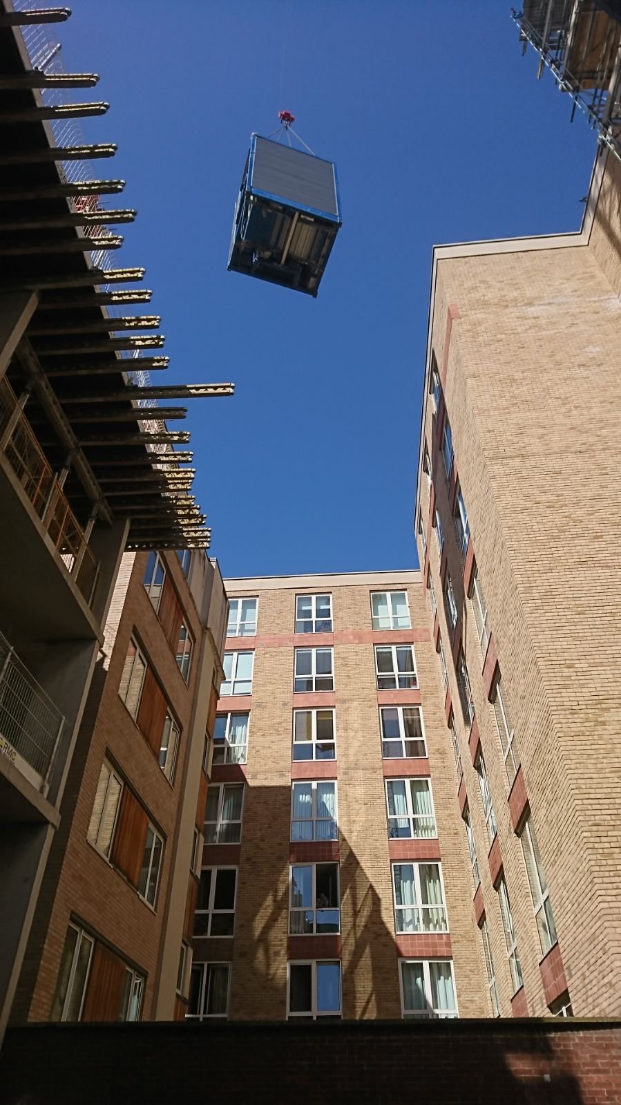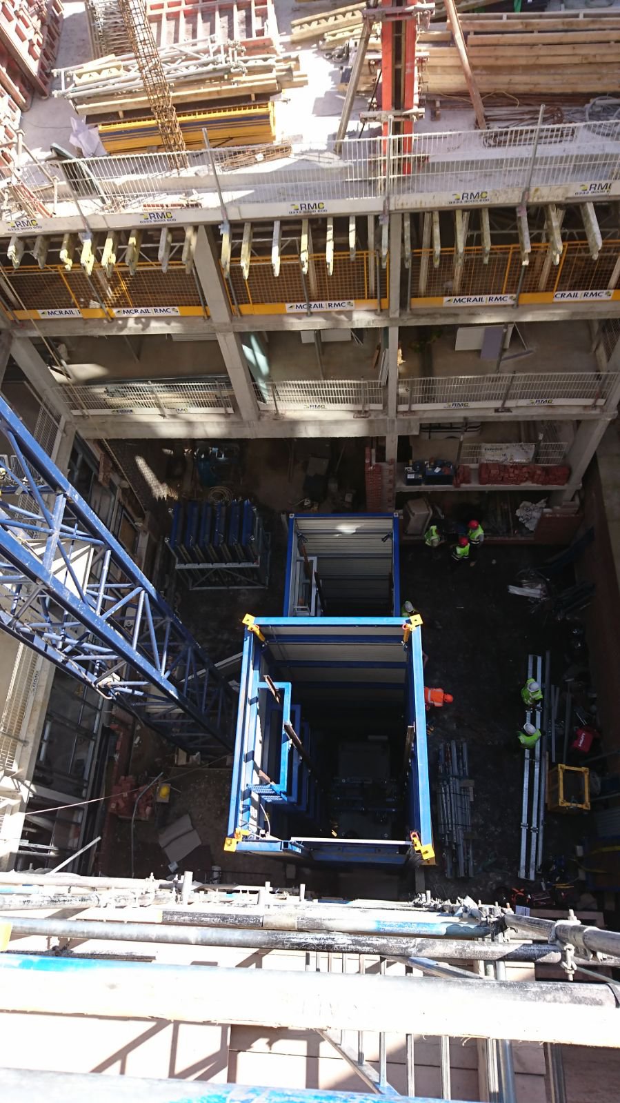 Adjacent to the planned location for the RECO lift, a tower crane was located in the patio of the building complex. The tower crane was an asset in assembling the modular RECO lift. However, the basic module including the lift cabin proved to be too heavy for the tower crane. To resolve this issue, RECO removed the lift cabin from the basic module, leaving the total weight under 3500 kg. It took only two working days to install the temporary RECO lift.