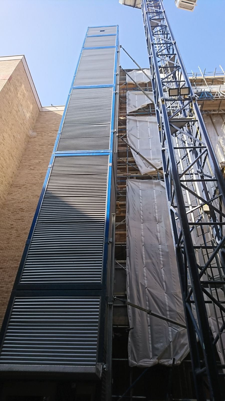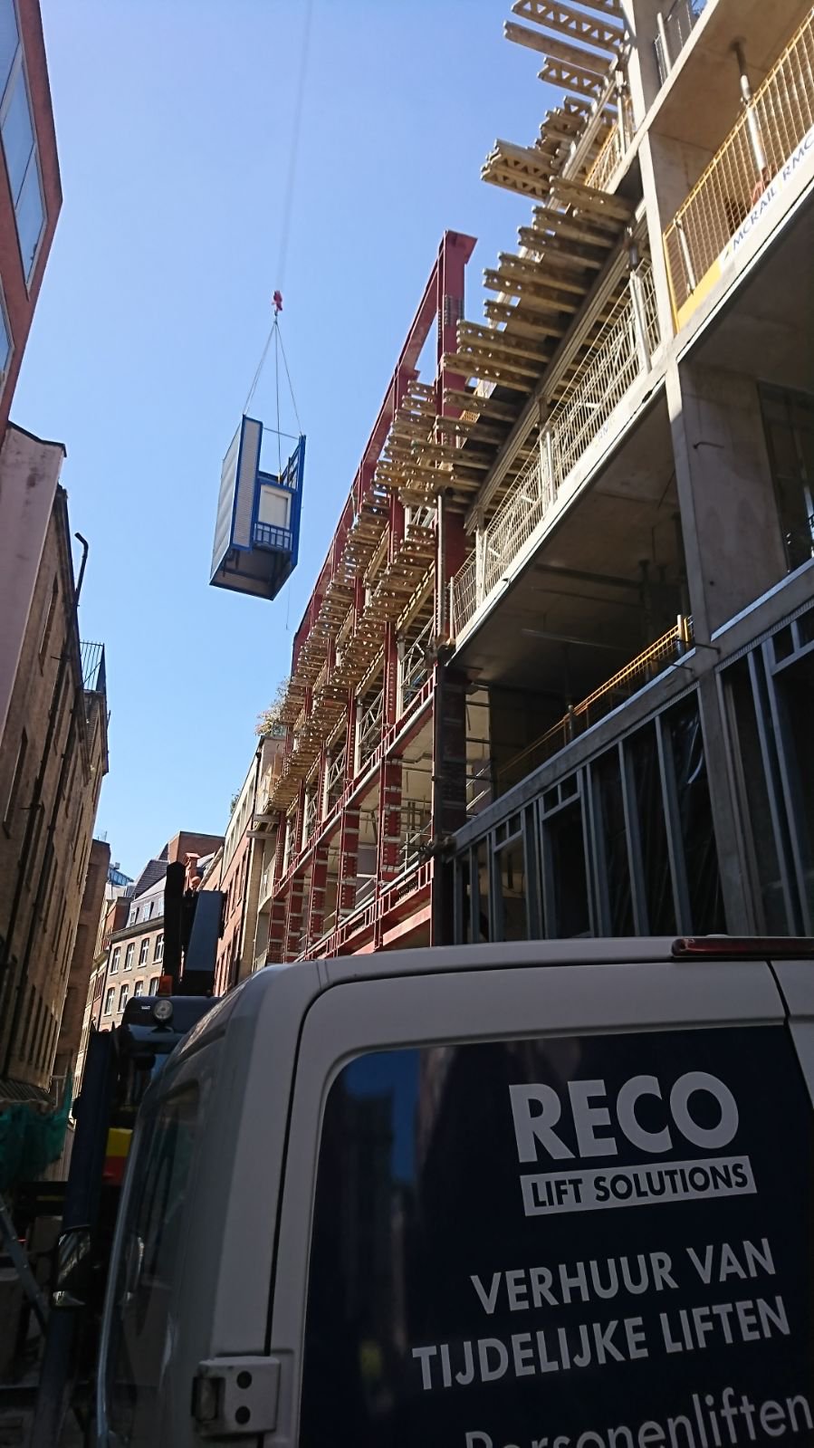 Following the installation of a RECO PP lift at Imperial College University (Kier Construction Ltd) in 2016, this is the second time that RECO has installed a seven-stop temporary PP passenger lift in London city centre. It proved to be no problem at all for PAX – the transport company based in Heerenveen that RECO is always happy to turn to – to deliver the lift modules to Cock Lane. Using three tractor-trailer combinations, the entire RECO lift was transported from Waddinxveen to London.