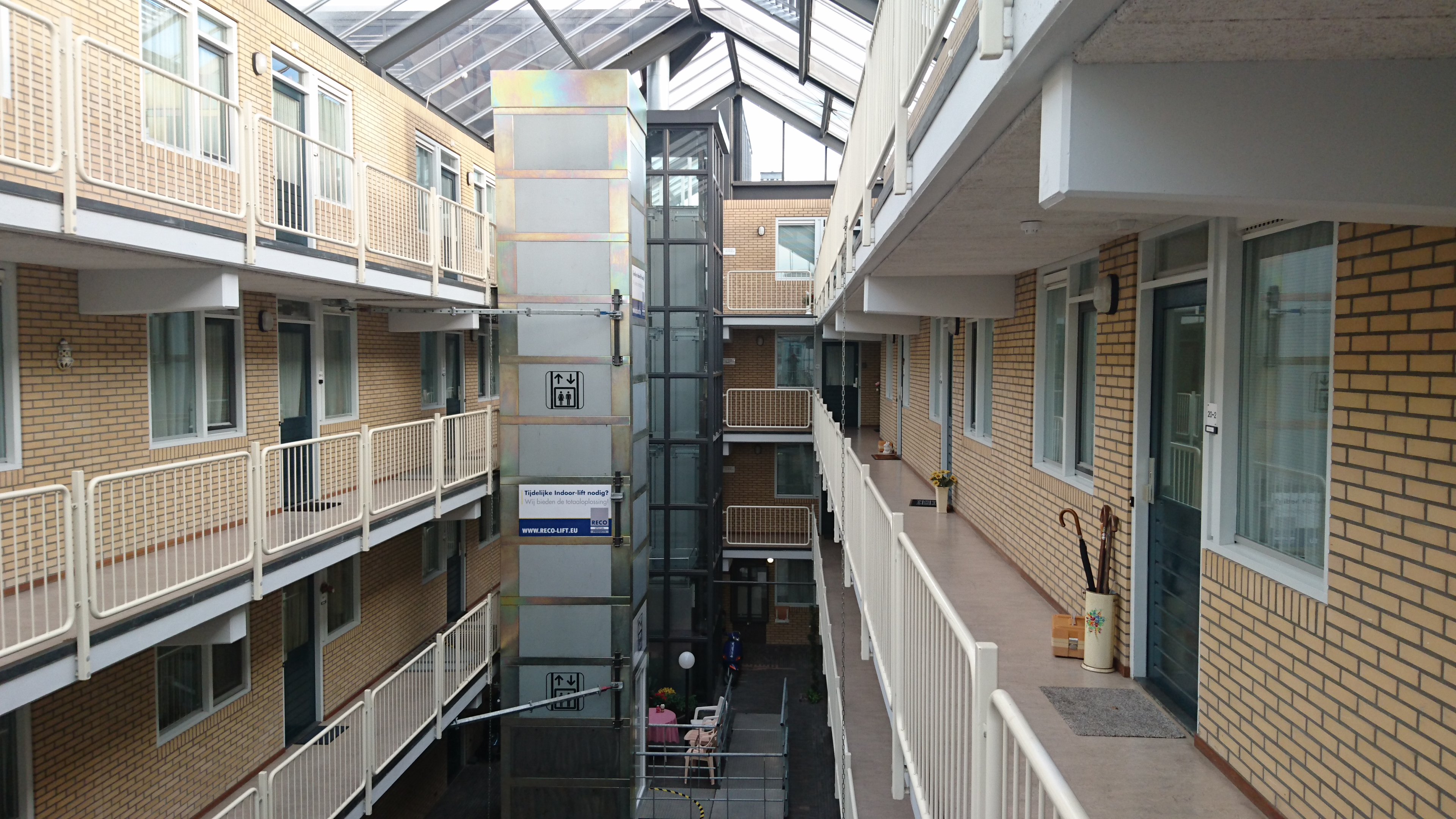 The latest addition to the already extensive fleet of RECO lifts has been in operation for the first time this week in a senior citizens' complex with an atrium. The building in question could not be reached from the outside with a standard RECO lift. An excellent opportunity to use the new Indoorlift because the building does have a beautiful interior that is perfect for the erection of the RECO Indoorlift.