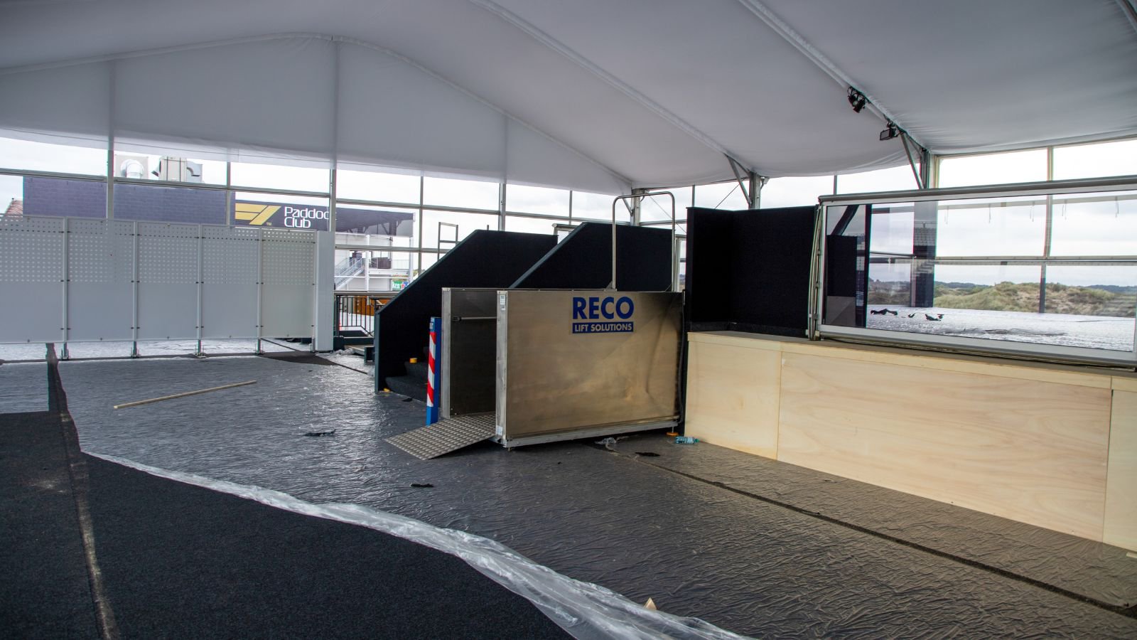 The temporary staircase is made to fit seamlessly in the area. The steps are covered by non-slip surface plates and the fences can be covered in colored fabric. For visitors who are visually impaired we can equip special handrails. This allows people to touch and grab the handrails more easily.