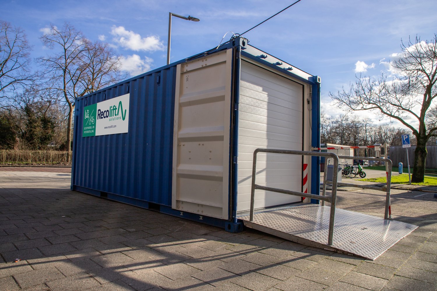 De scootmobielstalling kan natuurlijk ook worden ingezet voor het stallen van fietsen. Bijvoorbeeld aan de Angelslo in Rotterdam, waar liftwerkzaamheden plaatsvonden. Om de bewoners mobiel te houden, hebben wij hier een onze GEDA multilift geplaatst in combinatie met 8 trapliften. Door onze tijdelijke lift was de ingang van fietsenstalling geblokkeerd. Om dit op te lossen is er gekozen om een tijdelijke scootmobielstalling te plaatsen. Zo konden bewoners hun fietsen en scootmobielen veilig stallen!