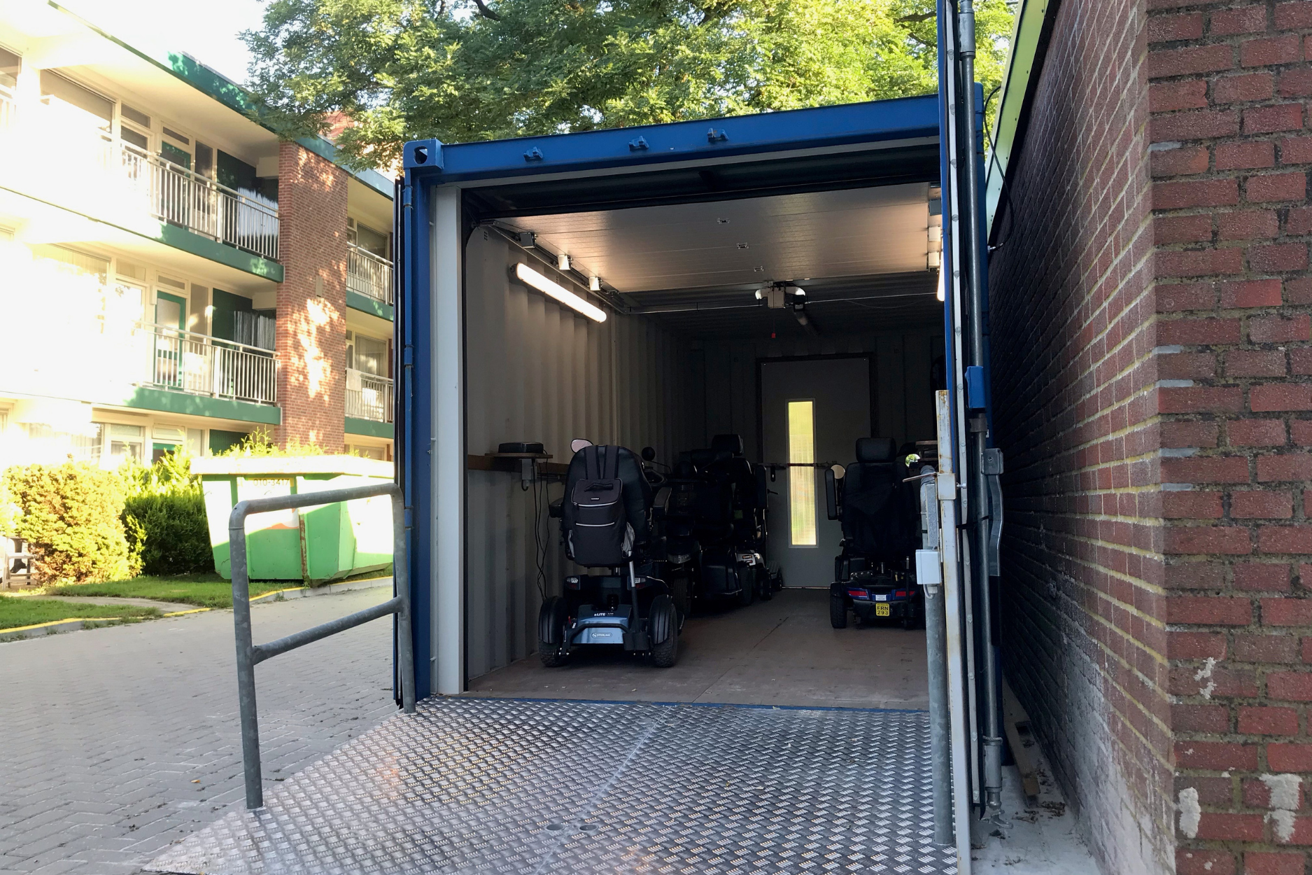 De scootmobiel is voor mindervalide bewoners een belangrijk vervoersmiddel. Bij liftuitval of werkzaamheden aan het pand kan het gebeuren dat de scootmobiel niet mee naar boven kan. Bijvoorbeeld omdat er geen ruimte is voor een tijdelijke personenlift met genoeg ruimte of door werkzaamheden op de galerijen. In dat geval kunt u een tijdelijke scootmobielstalling huren. Zo blijven de scootmobielen toegankelijk voor de bewoners.