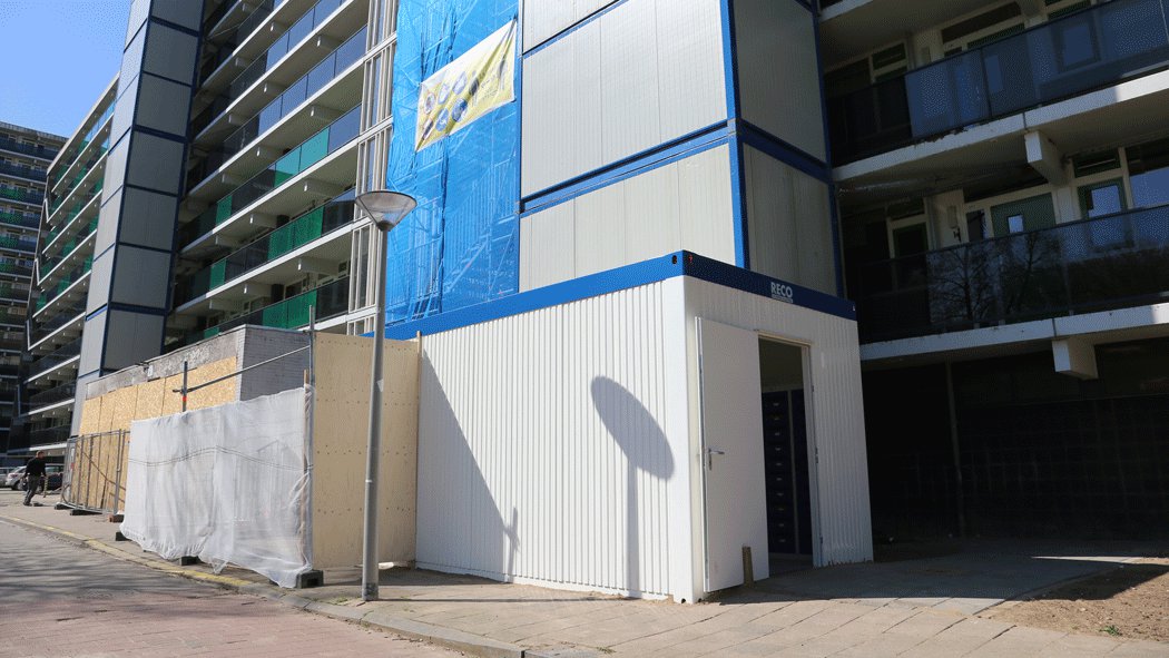 Zolang de ingang nog niet hersteld is, maken de bewoners gebruik van een tijdelijke ingang met postbussen om de flat in te gaan en hun post te halen. Hiervoor hebben we een tijdelijke unit als hal laten plaatsen inclusief postbussen. We hopen hiermee de situatie makkelijker te maken voor de bewoners terwijl Van Wijnen de herstelwerkzaamheden afrondt.