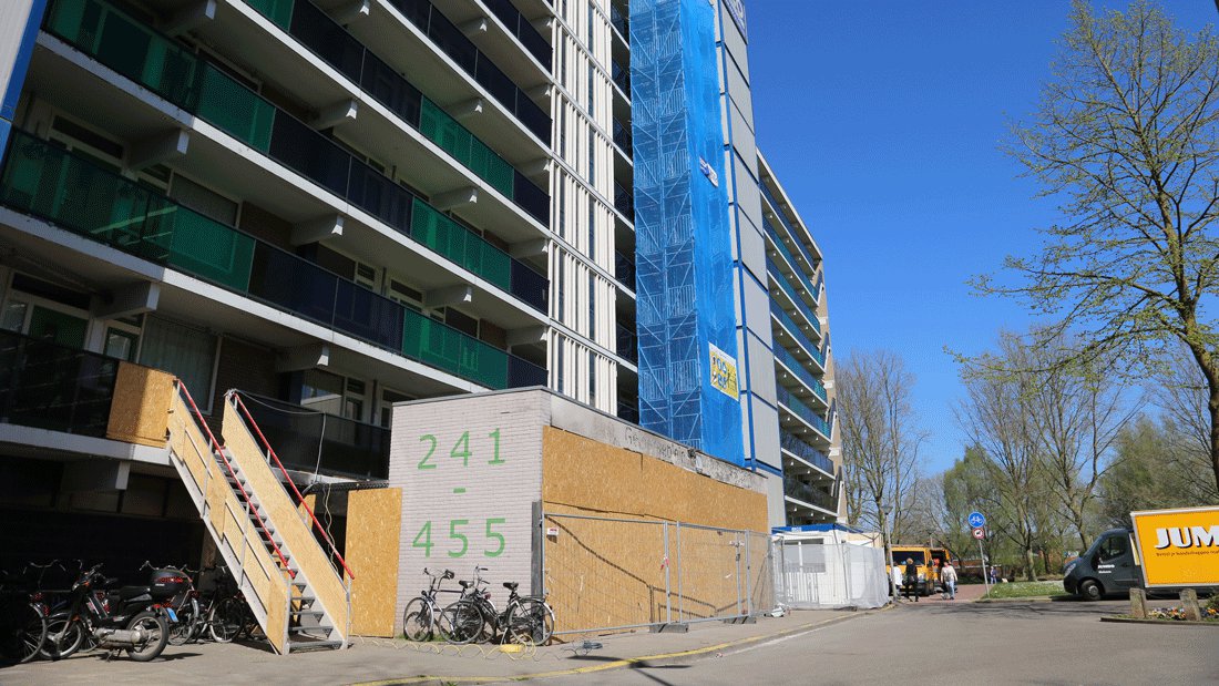 Noodliften, trappentoren en tijdelijke ingang voor bewoners na flatbrand Gelderseplein Arnhem