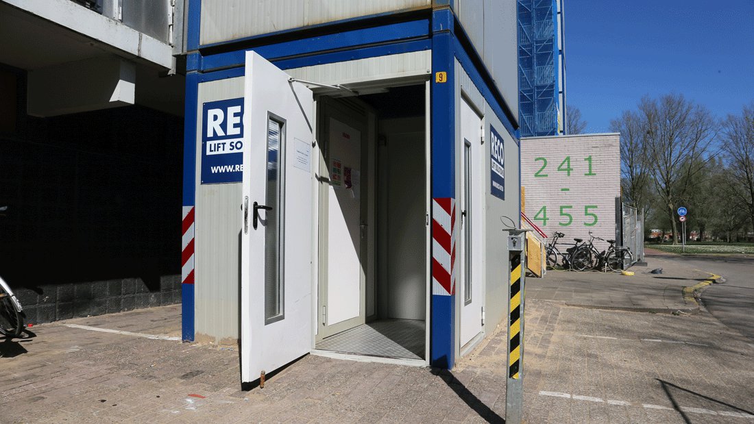 Tijdens de jaarwisseling van 2019 naar 2020 ontstond er brand bij de ingang van een flat aan het Gelderseplein. Als gevolg van de brand raakte de inpandige lift in storing. Hierdoor kwam een gezin vast te zitten in de lift, met fatale gevolgen voor de vader (39) en zijn zoon (4). Na deze tragische gebeurtenis heeft de woningcorporatie direct geschakeld met Reco Lift Solutions om de bewoners zo snel mogelijk een noodlift aan te bieden. Voor dit project hebben we een one-stop-shop oplossing gerealiseerd; een complete tijdelijke ingang met twee noodliften en een trappentoren.