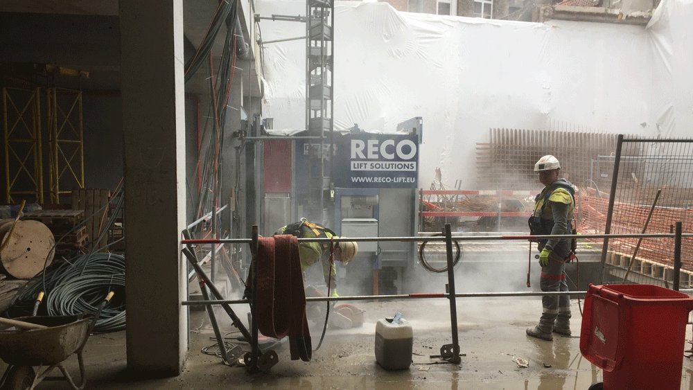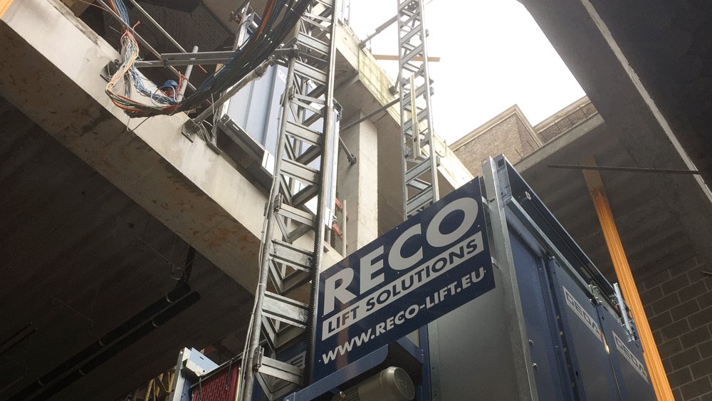 De tijdelijke personenlift staat op de keldervloer van de parkeergarage op verdieping -2 opgesteld. Door het beperkte draagvermogen van deze vloer (max. 250 Kg/m2), heeft RECO Lift Solutions voor de compacte, lichtgewicht GEDA P18S personenlift gekozen. Een bijkomend voordeel van het beperkte gewicht dit type tijdelijke personenlift, was dat het met de aanwezige torenkraan in de tijdelijke vide van het pand kon worden ingehesen.
