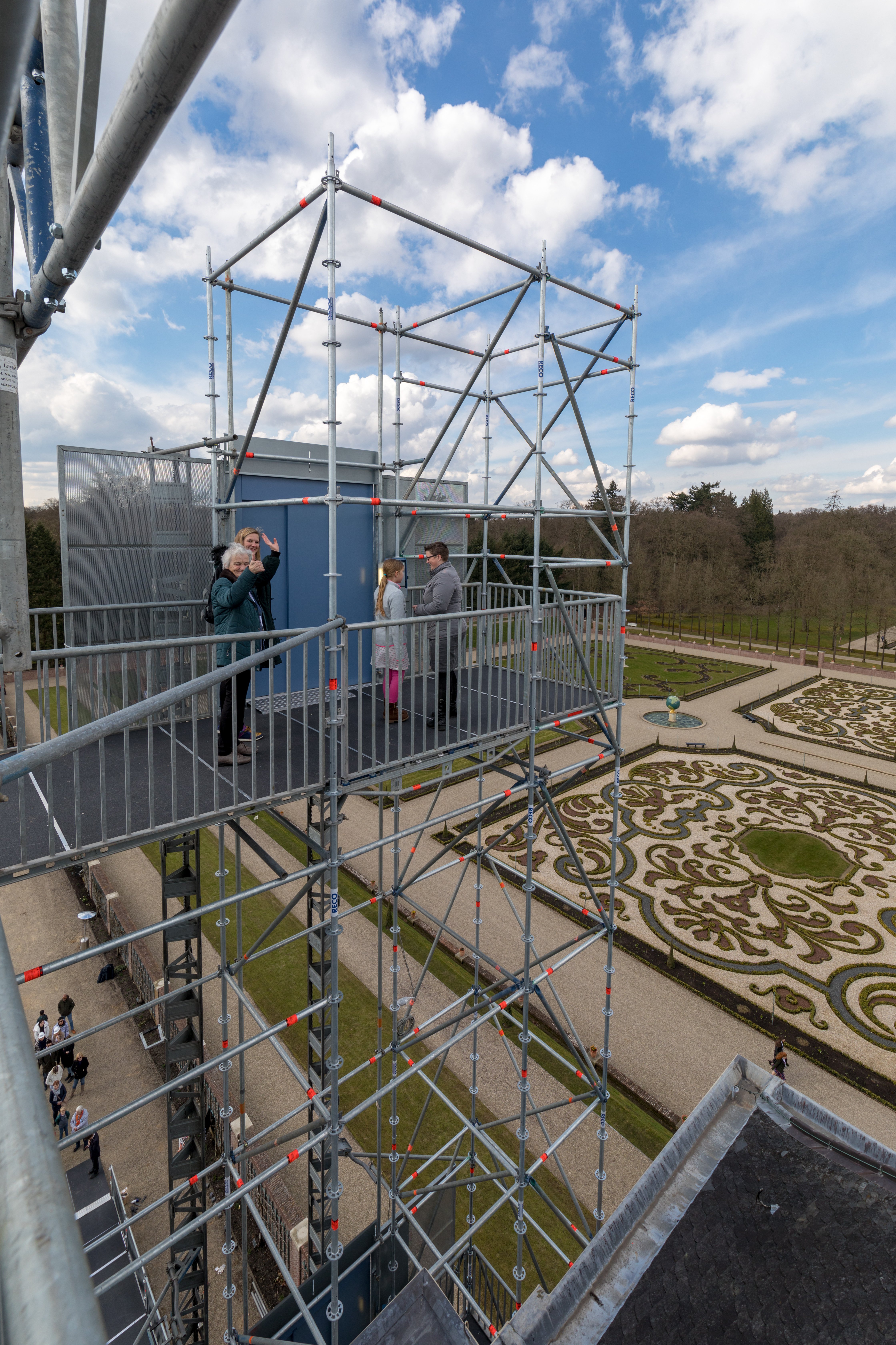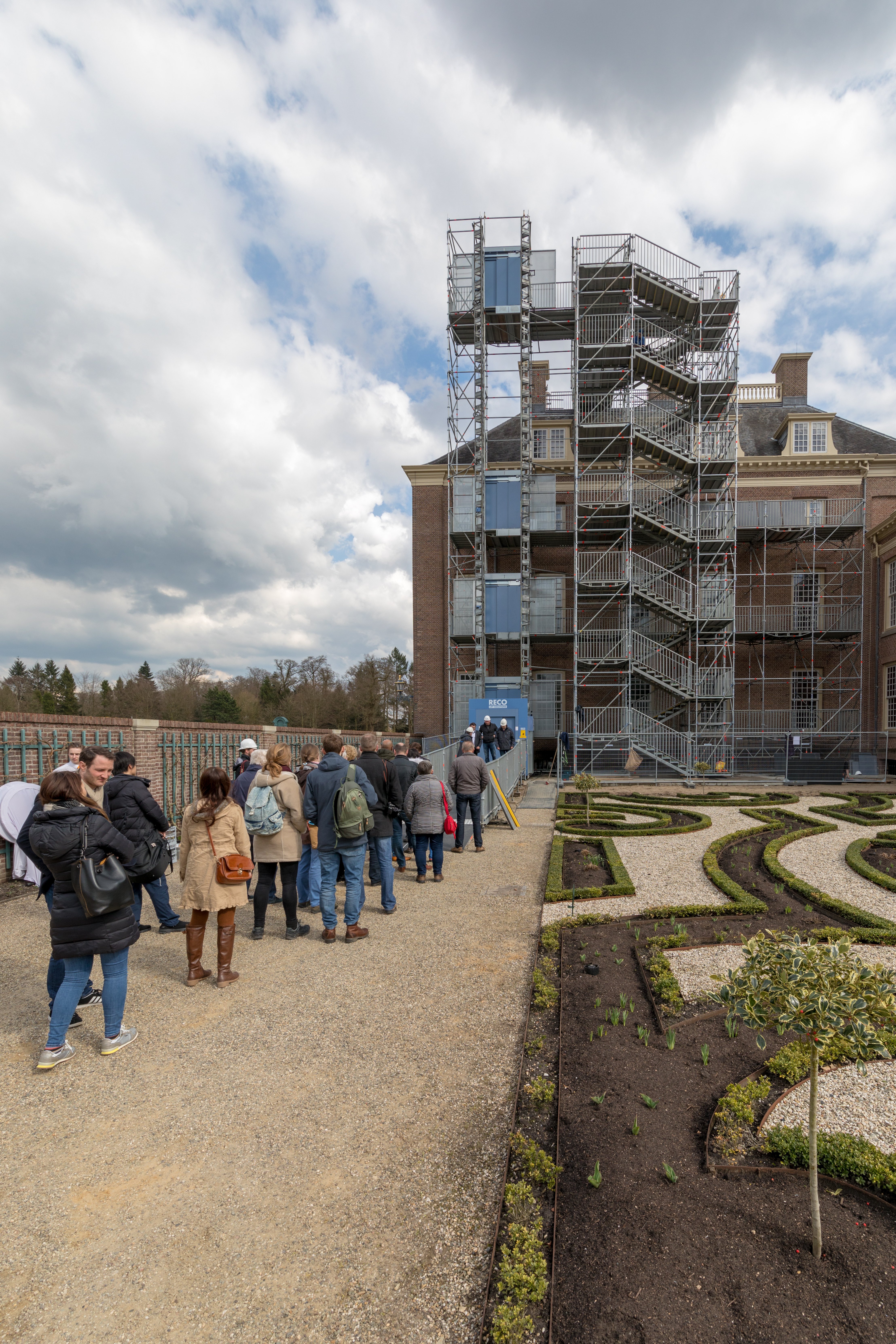 Onze specialisten werkten de afgelopen maanden een adviesplan uit, toegespitst op het toegankelijk houden van de locatie ondanks de renovatiewerkzaamheden. Binnen 6 en halve werkdag werd de tijdelijke buitenopstelling met stroomvoorzieningen, personenlift en voetgangerstraversen geïnstalleerd door onze monteurs. Met een buitenopstelling van drie galerijen volgt de bezoeker de renovatiewerkzaamheden in het pand. De trappen en tijdelijke personenlift brengen de bezoekers ook naar het ruim 20 meter hoge dak van het paleis.