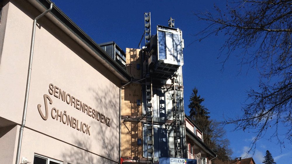 De personenlift in verzorgingstehuis Schönblick in Calw was nodig aan vervanging toe. ThyssenKrupp AG heeft hier onlangs een nieuwe personenlift geïnstalleerd. Om gedurende de liftmodernisatie de verdiepingen voor bewoners barrière- vrij toegankelijk te houden, heeft Reco Lift Solutions een tijdelijke 4 stops GEDA P18S personenlift geplaatst.