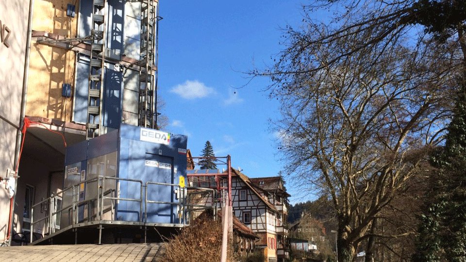 Tijdelijke GEDA P18S personenlift ingezet in Calw tijdens liftmodernisering verzorgingstehuis