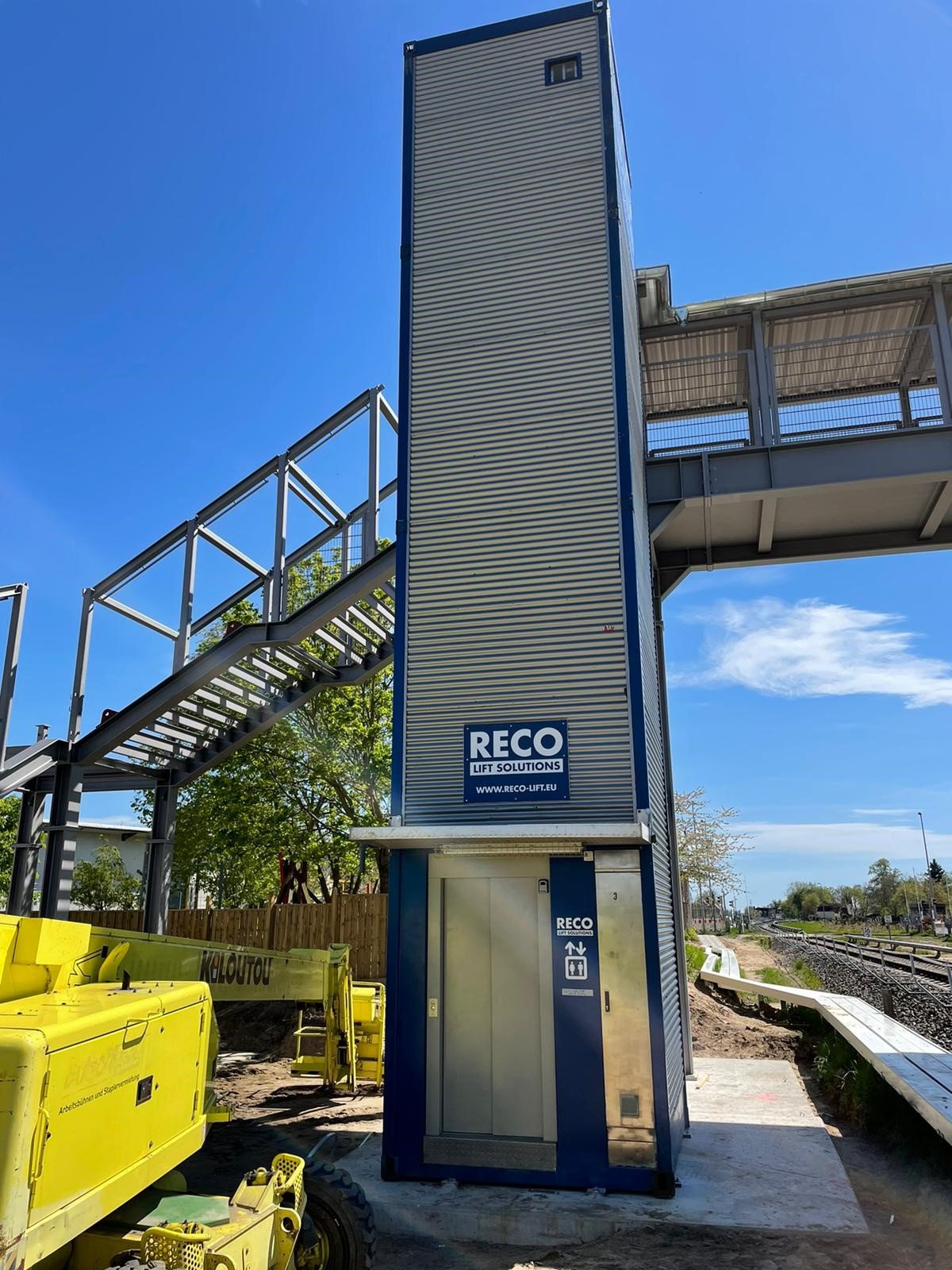 In opdracht van de Duitse STRABAG Rail GmbH hebben we de tijdelijke voetgangersbrug in Mahlow uitgerust met 2 tijdelijke personenliften. STRABAG Rail GmbH heeft 2 gecombineerde betonfunderingen voor de brug en de lift aangelegd. Door de liftschachten van 12 meter in de fundering te verankeren, was verankering van de personenliften aan de tijdelijke brug niet nodig. Zoals bij veel tijdelijke bruggen en spoorwegovergangen zijn de Reco Plug and Play liften de beste personenliften voor dit project.